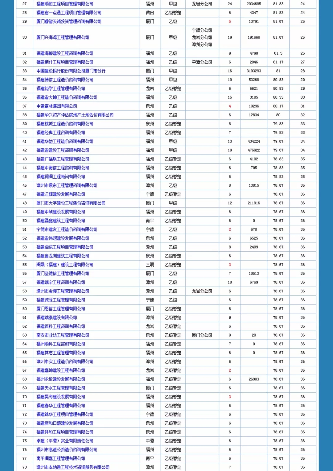 近日,福建省建设工程造价信息网公布《2017年度工程造价咨询企业信用综合评价结果》。 我公司2017年度信用得分排名第七,2017年度备案项目总造价排名第三。两项指标综合体现了我公司综合实力强,在福建业内名列前茅,仅次于央企建行福建省分行。我公司将再接再励,向同行先进单位学习,进一步提高发展!