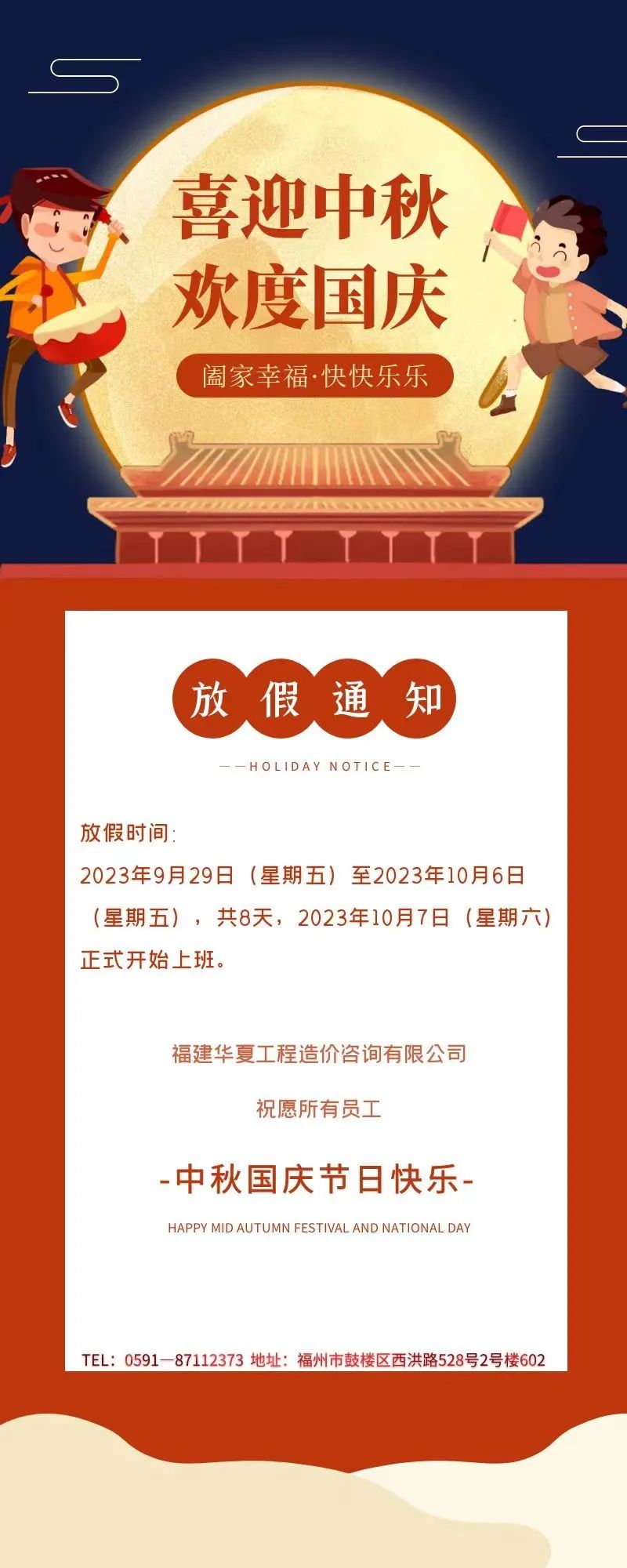 海上生明月,天涯共此时!华夏造价祝大家中秋国庆双节快乐!